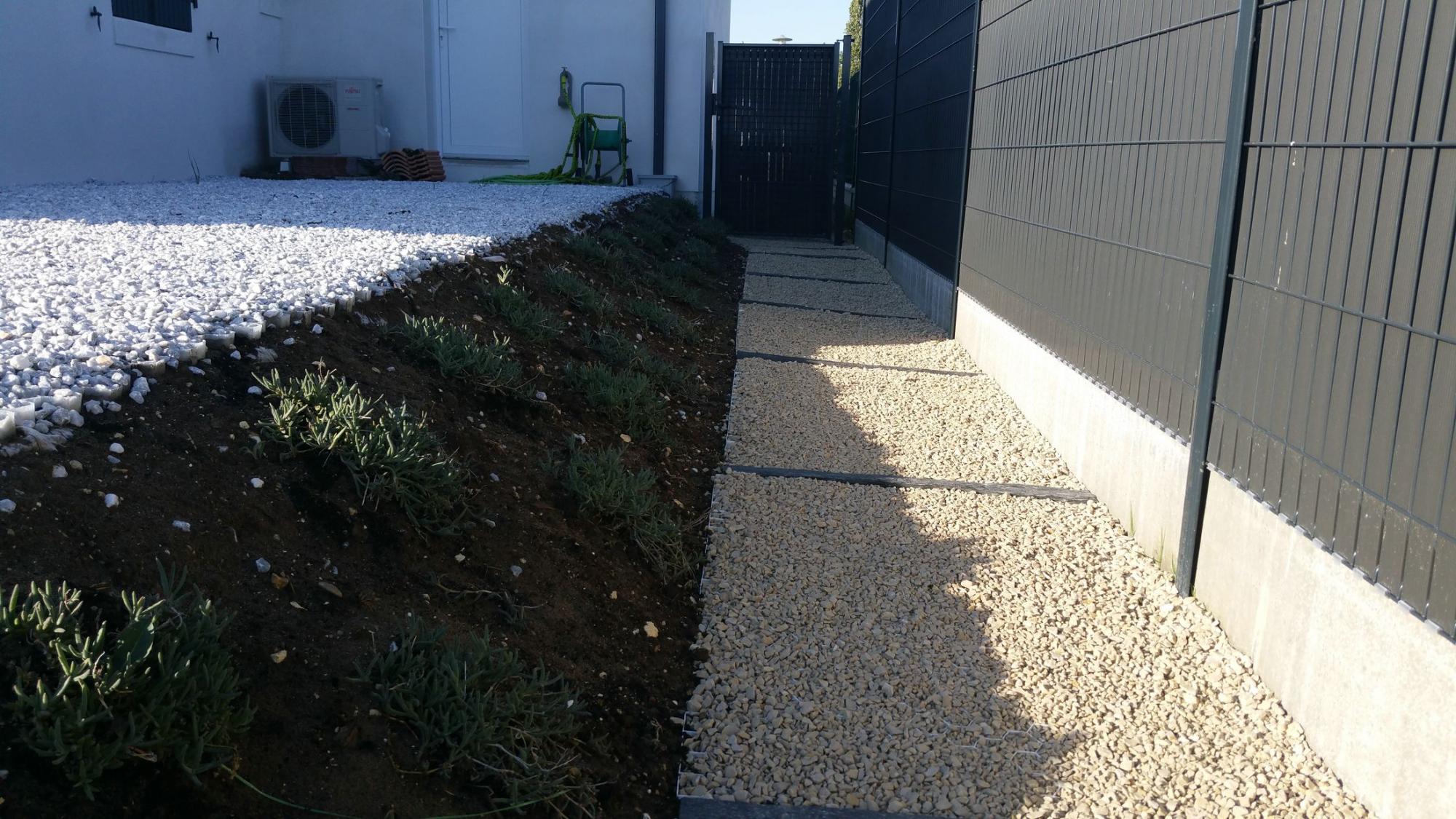 Aménagement d'un jardin minéral, confection d'une escalier, d'une pelouse, d'une allée en nidagravel ... à Grand-Village (Île d'Oléron).